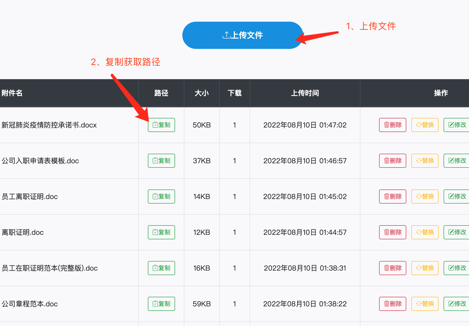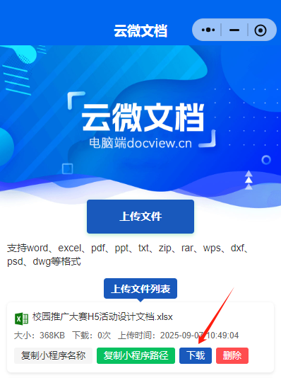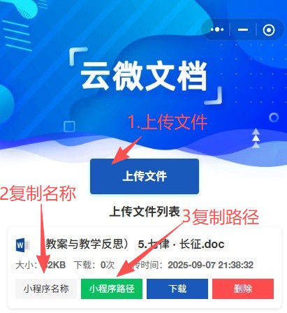 类型 | 文件名 | 小程序路径 | 直达路径 | 文件二维码 | 大小 | 下载次数 | 上传时间 | 操作 |